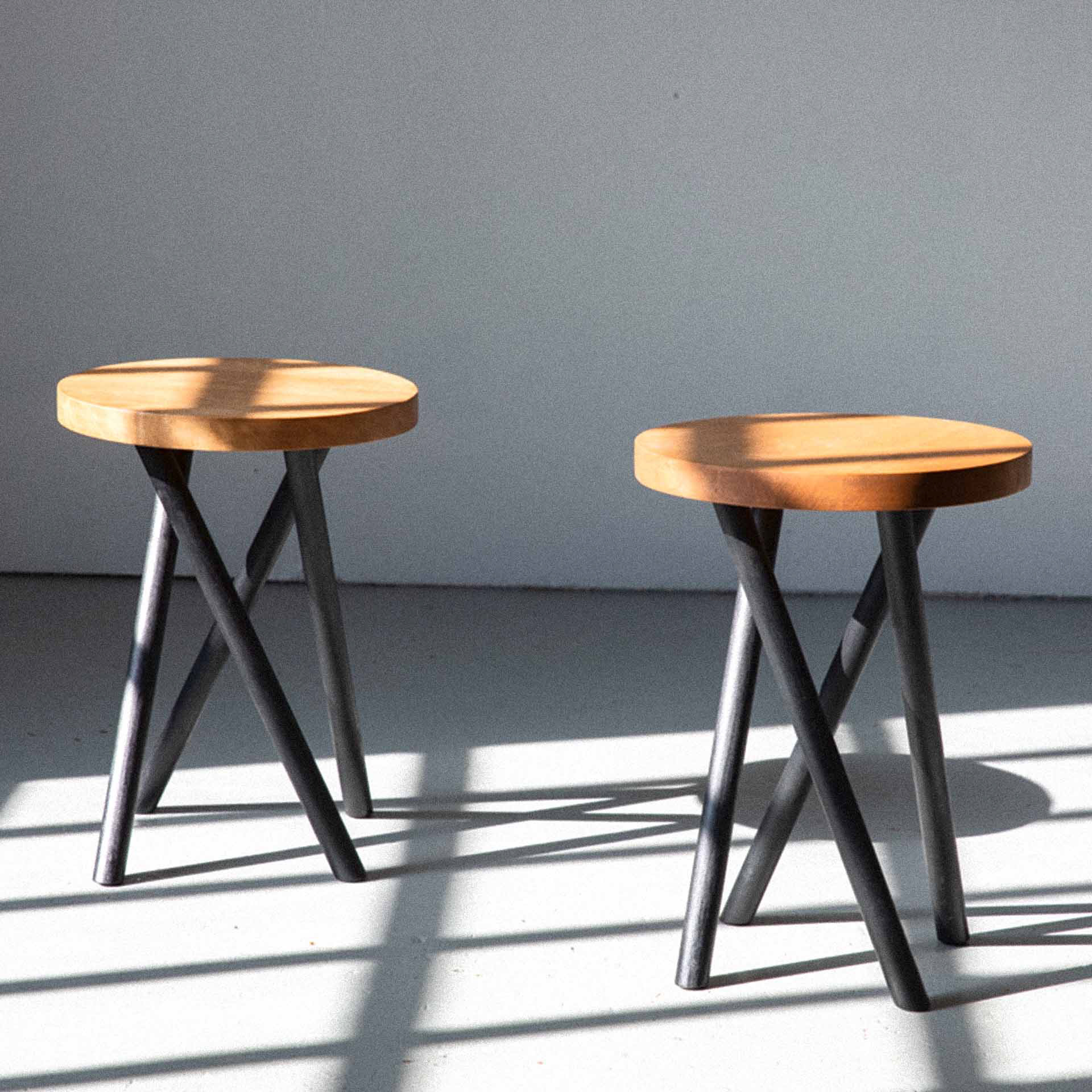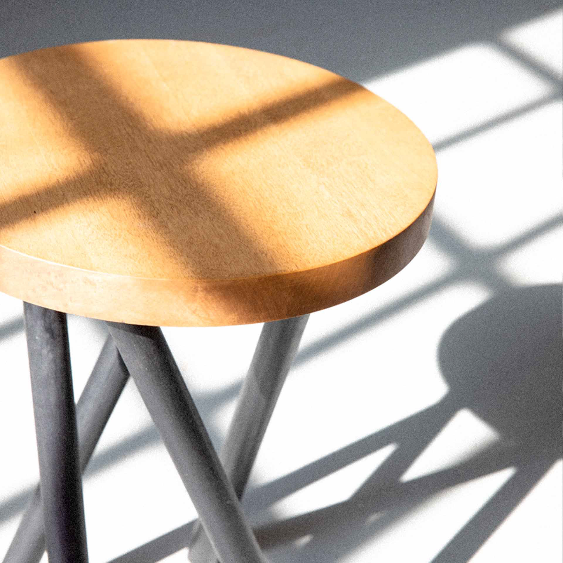 A minimalist stool defined by a quad-leg structural intersection. The design utilizes a circular wooden seat supported by four intersecting members that create a self-reinforcing, asymmetrical frame. The composition focuses on the visual tension between the solid timber surface and the rhythmic, linear legs.