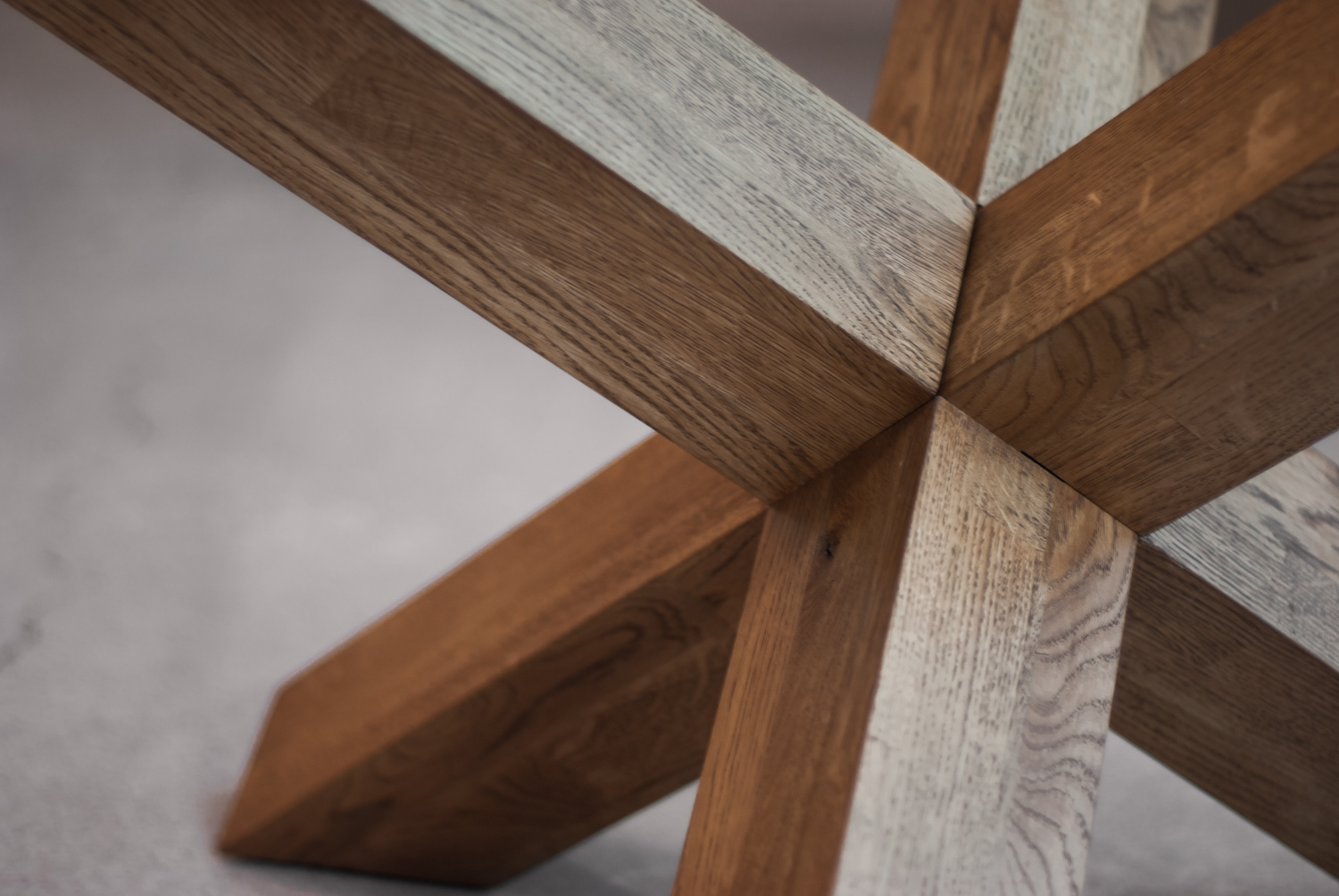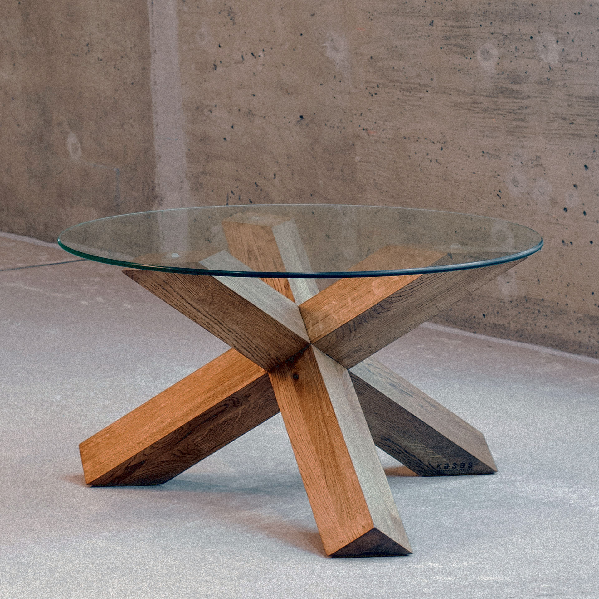 A three-piece construction based on the logic of a Chinese puzzle (Lu Ban Lock). The solid oak beams are precisely notched to interlock at a single center point, creating a self-securing frame held together by geometry rather than glue or screws. The joint's mechanical nature allows the table to be easily disassembled for transport or storage. A glass top is used to reveal the internal lock that holds the system together.